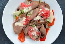 Язык отварной, салат айсберг, грузди маринованные, перец маринованный, огурец консервированный, лук “Shelby”, фирменный соус с хреном 315 гр
