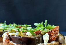 Ржаная чиабатта, сливочный сыр, баклажаны, сыр с голубой плесенью, вяленые томаты, каперсы и руккола 230 гр