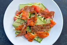 Лосось, бекон копчено-вареный, салат айсберг, огурец свежий, томат, сельдерей, руккола, кунжут, соус с кленовым сиропом 310 гр